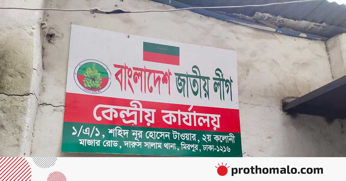 ভবনের কোথাও কার্যালয় খুঁজে না পেয়ে দলটির চেয়ারম্যান মাহবুবুল আলমের সঙ্গে মুঠোফোনে আবার যোগাযোগ করেন এই প্রতিবেদক। তিনি ১০ মিনিট অপেক্ষা করতে বলেন। কিছুক্ষণের মধ্যেই ভবনের সামনে আসেন তিনি। পরে তাঁর সঙ্গে ভবনের ভেতরে ঢুকে দেখা যায়, নিচতলার ডান পাশে একটি সরু সিঁড়ি নিচের দিকে নেমে গেছে। ওই সিঁড়ি দিয়ে কয়েক ধাপ নামার পর ডান দিকে একটু এগোলে ওপরের দিকে যাওয়ার আরেকটি সিঁড়ি আছে। সেই সিঁড়ি ধরে কিছুটা ওপরে উঠতেই এক কক্ষের ছোট্ট একটি কার্যালয়। কক্ষের সামনের দেয়ালে ‘বাংলাদেশ জাতীয় লীগ’ লেখা ছোট ব্যানার টাঙানো আছে।