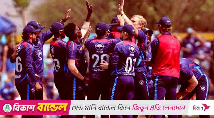 জবাবে ব্যাট করতে নেমে নামিবিয়ার ব্যাটিংও খুব একটা ভালো ছিল না। তবে অধিনায়ক গেরহার্ড ইরাসমাস এবং উইকেটকিপার-ব্যাটার জানে গ্রিন দলের ইনিংসকে ধরে রাখেন। শেষ মুহূর্তে যখন খেলা চরম উত্তেজনার মুখে, তখন ক্রিজের এক প্রান্তে উপস্থিত ছিলেন ট্রাম্পেলম্যান। অবশেষে, ম্যাচের একদম শেষ বলে বাউন্ডারি মেরে দলকে ১ উইকেটের অবিস্মরণীয় জয় এনে দেন জানে গ্রিন। তিনি অপরাজিত থাকেন ৩০ রানে।