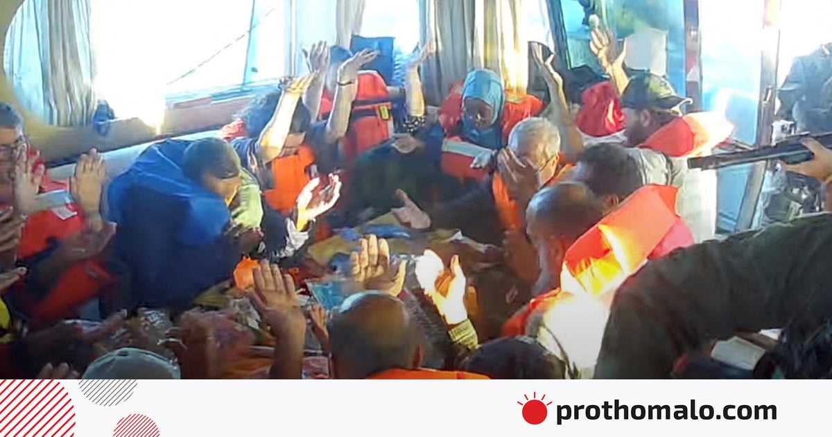 এর কিছুক্ষণ পর ইসরায়েলি নৌবাহিনীর জাহাজ থেকে সেনারা নৌযানগুলোয় একে একে প্রবেশ শুরু করেন। বন্ধ করে দেওয়া হয় নৌযানগুলোর যোগাযোগব্যবস্থা। সেগুলো লক্ষ্য করে জলকামান দিয়ে ছোড়া হয় পানিও। নৌযানগুলো থেকে সরাসরি সম্প্রচার করা ভিডিওতে অধিকারকর্মীদের দিকে বন্দুক তাগ করে রাখতে দেখা যায় ইসরায়েলি সেনাদের।
