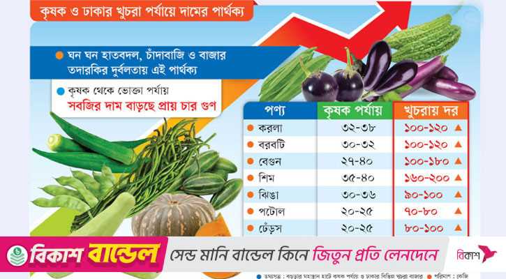 কৃষক থেকে রাজধানীর খুচরা বাজারে পৌঁছতে পৌঁছতে সবজির দাম বেড়ে প্রায় চার গুণ হয়ে যাচ্ছে। ঘন ঘন হাতবদল, চাঁদাবাজি ও বাজার তদারকির দুর্বলতায় কৃষক থেকে দামের এই পার্থক্য তৈরি হচ্ছে।