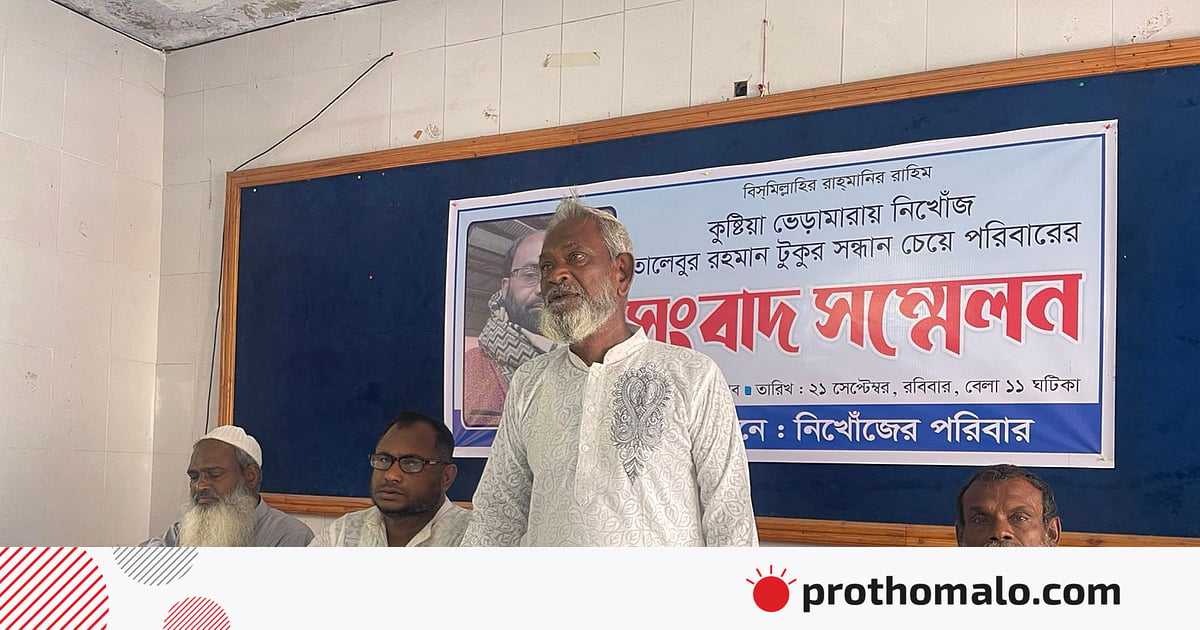 আজ রোববার দুপুরে কুষ্টিয়া প্রেসক্লাবে নিখোঁজ তালেবুর রহমান ওরফে টুকুর (৫২) পরিবারের পক্ষ থেকে আয়োজিত সংবাদ সম্মেলনে এ দাবি জানান তাঁর বড় ভাই জারমান আলী। তালেবুর রহমান ভেড়ামারা উপজেলার ধরমপুর ইউনিয়নের পাটুয়াকান্দি গ্রামের বাসিন্দা। তিনি নাটোরের লালপুরে পদ্মা নদীর বালুঘাটে মোল্লা ট্রেডার্স নামে একটি প্রতিষ্ঠানে হিসাবরক্ষকের কাজ করতেন।