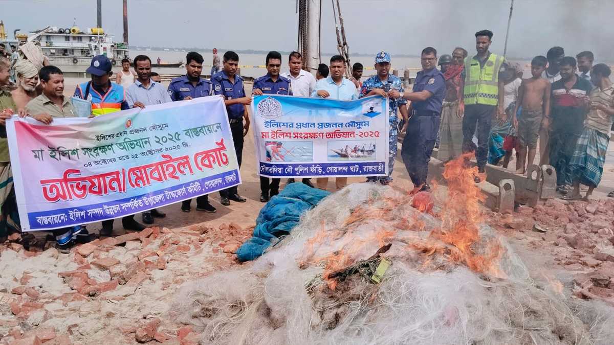মা ইলিশ সংরক্ষণ অভিযানে গত ২৪ ঘণ্টায় রাজবাড়ীর পদ্মা নদীর অংশে অভিযান পরিচালনা করে ৫০ হাজার মিটার জাল ও ৫ কেজি ইলিশ জব্দের পাশাপাশি একটি মাছ ধরা নৌকা আটক করে নিলামে বিক্রি করা হয়েছে।