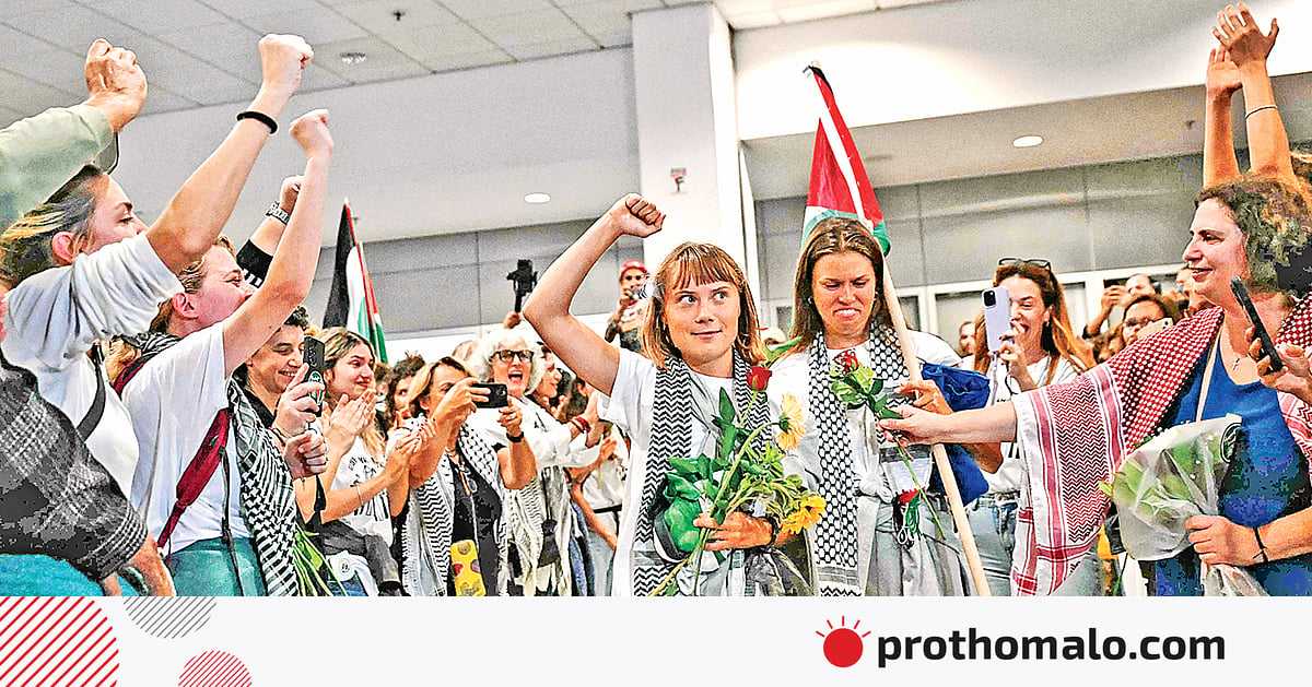 গতকাল বাংলাদেশ সময় রাত পৌনে ১০টার দিকে গ্রিসের রাজধানী এথেন্সে পৌঁছান সুইডিশ অধিকারকর্মী গ্রেটা থুনবার্গ। এথেন্স আন্তর্জাতিক বিমানবন্দরে গ্রেটাসহ অন্য অধিকারকর্মীদের ফুল দিয়ে স্বাগত জানান তাঁদের সমর্থকেরা। সে সময় অনেকের হাতেই ছিল ফিলিস্তিনের পতাকা।