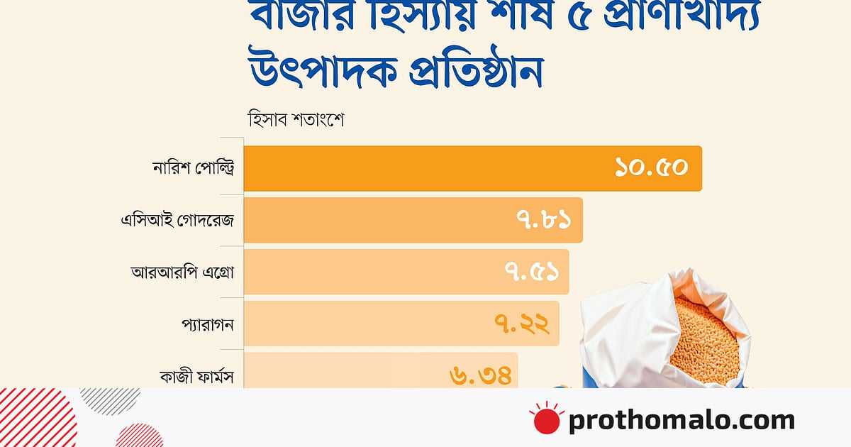 আর্থিক প্রতিষ্ঠান আইডিএলসি গত মার্চে দেশের ফিডশিল্প নিয়ে একটি প্রতিবেদন প্রকাশ করেছে। তাতে দেখা যায়, এই বাজারের সর্বোচ্চ হিস্যা নারিশ পোলট্রির, সাড়ে ১০ শতাংশ বাজার তার দখলে। আর ৭ দশমিক ৮১ শতাংশ বাজার অংশীদারি নিয়ে এই তালিকায় দ্বিতীয় অবস্থানে রয়েছে এসিআই গোদরেজ। আরআরপি অ্যাগ্রোর দখলে রয়েছে ৭ দশমিক ৫১ শতাংশ বাজার। চতুর্থ ও পঞ্চম অবস্থানে রয়েছে প্যারাগন ও কাজী ফার্মস। এরপরের অবস্থানে রয়েছে যথাক্রমে সিপি বাংলাদেশ ও কোয়ালিটি ফিডস।