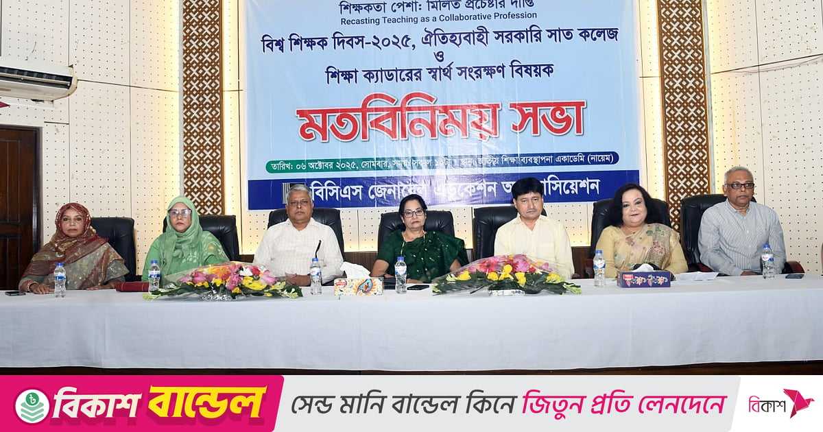 আজ সোমবার বিসিএস সাধারণ শিক্ষা ক্যাডারের কর্মকর্তাদের সংগঠন বিসিএস জেনারেল এডুকেশন অ্যাসোসিয়েশন উদ্যোগে আয়োজিত এক অনুষ্ঠানে এসব কথা বলা হয়। রাজধানীর জাতীয় শিক্ষা ব্যবস্থাপনা একাডেমিতে (নায়েম) অনুষ্ঠিত হয় ‘বিশ্ব শিক্ষক দিবস-২০২৫, ঐতিহ্যবাহী সরকারি সাত কলেজ ও শিক্ষা ক্যাডারের স্বার্থ সংরক্ষণ’ শীর্ষক এই মতবিনিময় সভা।