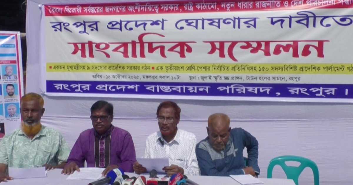 রংপুরকে প্রদেশ ঘোষণা করে একজন মুখ্যমন্ত্রীসহ ৯ সদস্যের প্রাদেশিক সরকার গঠনসহ ৯ দাবিতে সংবাদ সম্মেলন করেছে রংপুর প্রদেশ বাস্তবায়ন পরিষদ। মঙ্গলবার (১৪ অক্টোবর) সকাল সাড়ে ১০টায় রংপুর নগরীর জুলাই চত্বরে এ সম্মেলন অনুষ্ঠিত হয়।