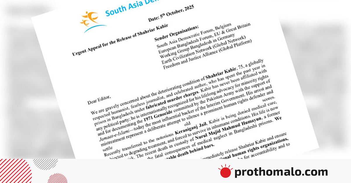 কারাবন্দী সাংবাদিক ও লেখক শাহরিয়ার কবিরকে অবিলম্বে মুক্তি দিতে এবং তাঁর নিরাপত্তা ও চিকিৎসা নিশ্চিত করতে সরকারের প্রতি আহ্বান জানিয়েছে ইউরোপ ও আন্তর্জাতিক পর্যায়ের পাঁচটি সংগঠন।