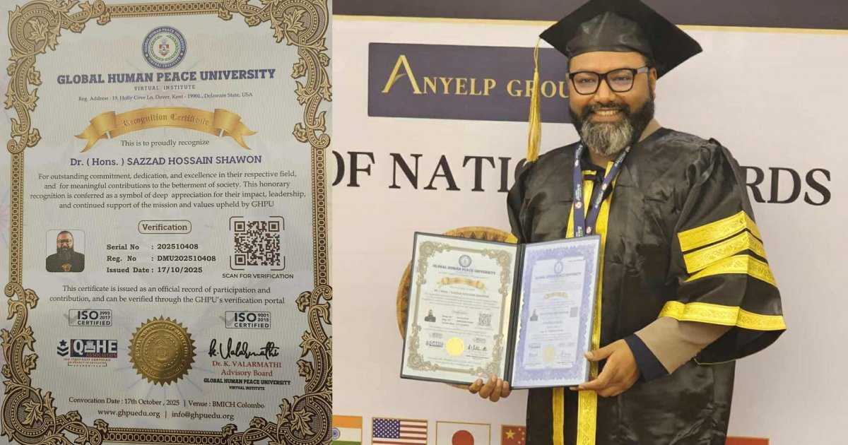 ভালো গাইয়ের হিসেবে সাজ্জাদ হোসেন শাওনের পরিচিতি গড়ে উঠেছে শাওন গানওয়ালা নামে। তবে সেই পরিচিতি ছাপিয়ে এবার তিনি অর্জন করেছেন নতুন পরিচয়। এখন তিনি ডক্টর শাওন। সম্প্রতি তাকে সম্মানসূচক ডক্টরেট ডিগ্রি প্রদান করেছে গ্লোবাল হিউম্যান পিস ইউনিভার্সিটি।